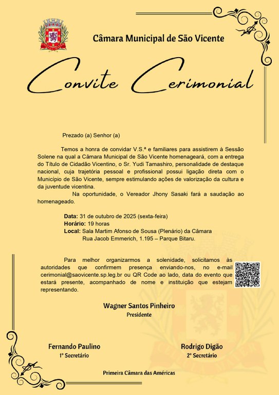 Convite para Sessão Solene: Entrega de Título ao Sr. Yudi Tamashiro