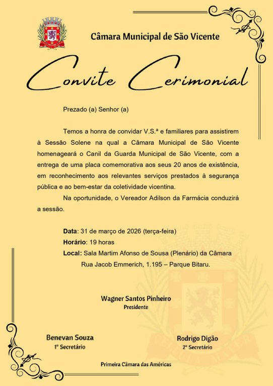 Convite para Sessão Solene: Homenagem ao Canil da Guarda Municipal de São Vicente