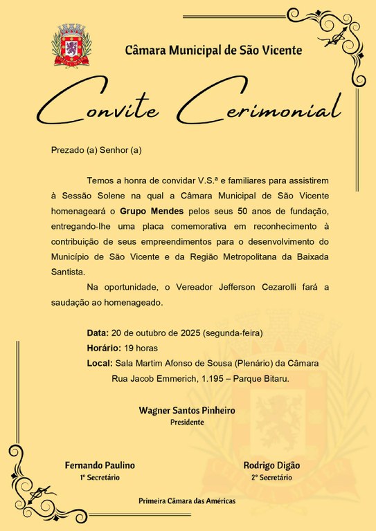 Convite para Sessão Solene: Homenagem aos 50 anos do Grupo Mendes